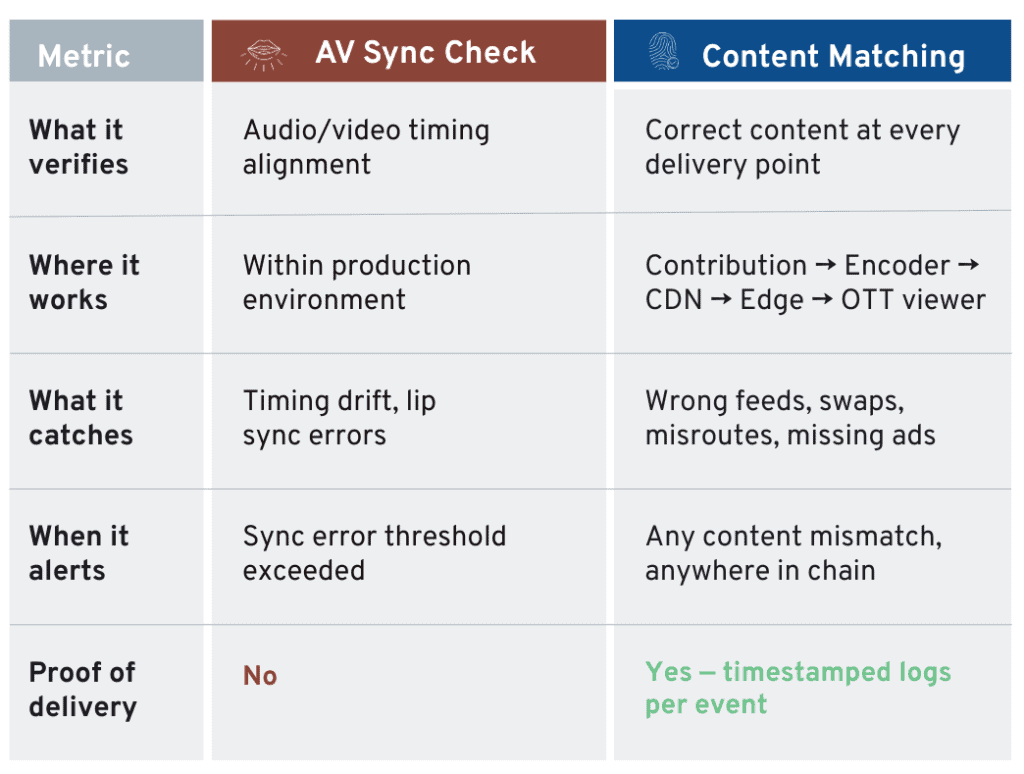 The bottom line: sync verification is necessary. It’s not sufficient. For operations running live events, FAST channels, multi-region distribution, or ad-supported tiers, content integrity monitoring is the safety net that catches what sync tools cannot see.