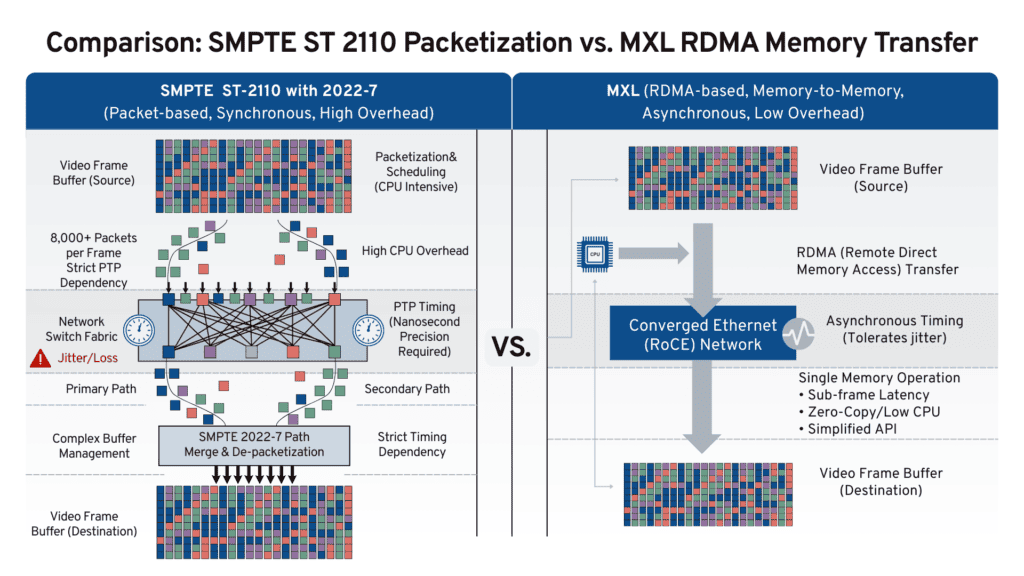 MXL replaces packet-by-packet video transport with something simpler: direct memory-to-memory transfer. Instead of assembling 8,000+ packets per frame with precise timing and managing their delivery across a specialized network, MXL treats a video frame the way your operating system treats any other chunk of data: move it from here to there, as fast as the network allows, without the ceremony.