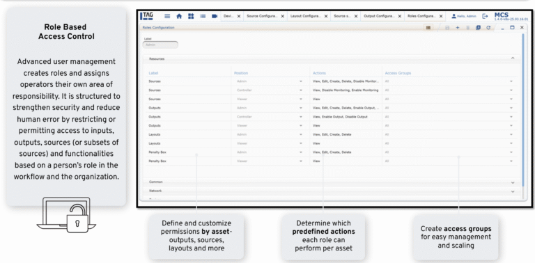 Advanced User Management in TAG’s Media Control System (MCS) allows administrators to define different user profiles, granting or restricting access to resources such as streams, monitoring actions, and system controls.