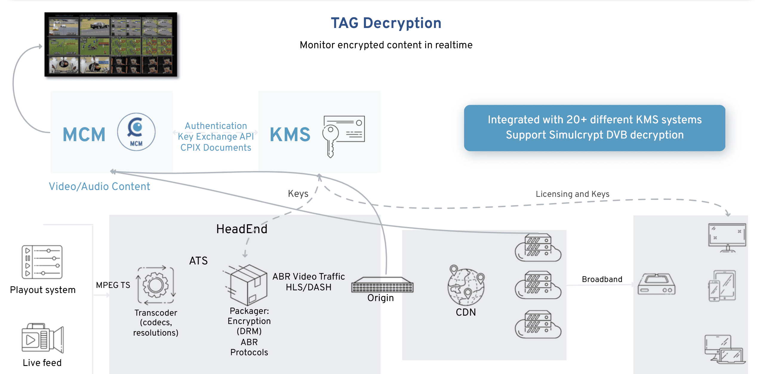 TAG’s Decryption feature enables secure, scalable, and efficient handling of encrypted video streams by integrating directly with leading Key Management Systems (KMS). Supporting standards such as AES-128 (CBC/CTR), BISS-2, CENC for multi-DRM, and DVB Simulcrypt, it allows operators to monitor both live and VOD content across broadcast, IPTV, and OTT environments.