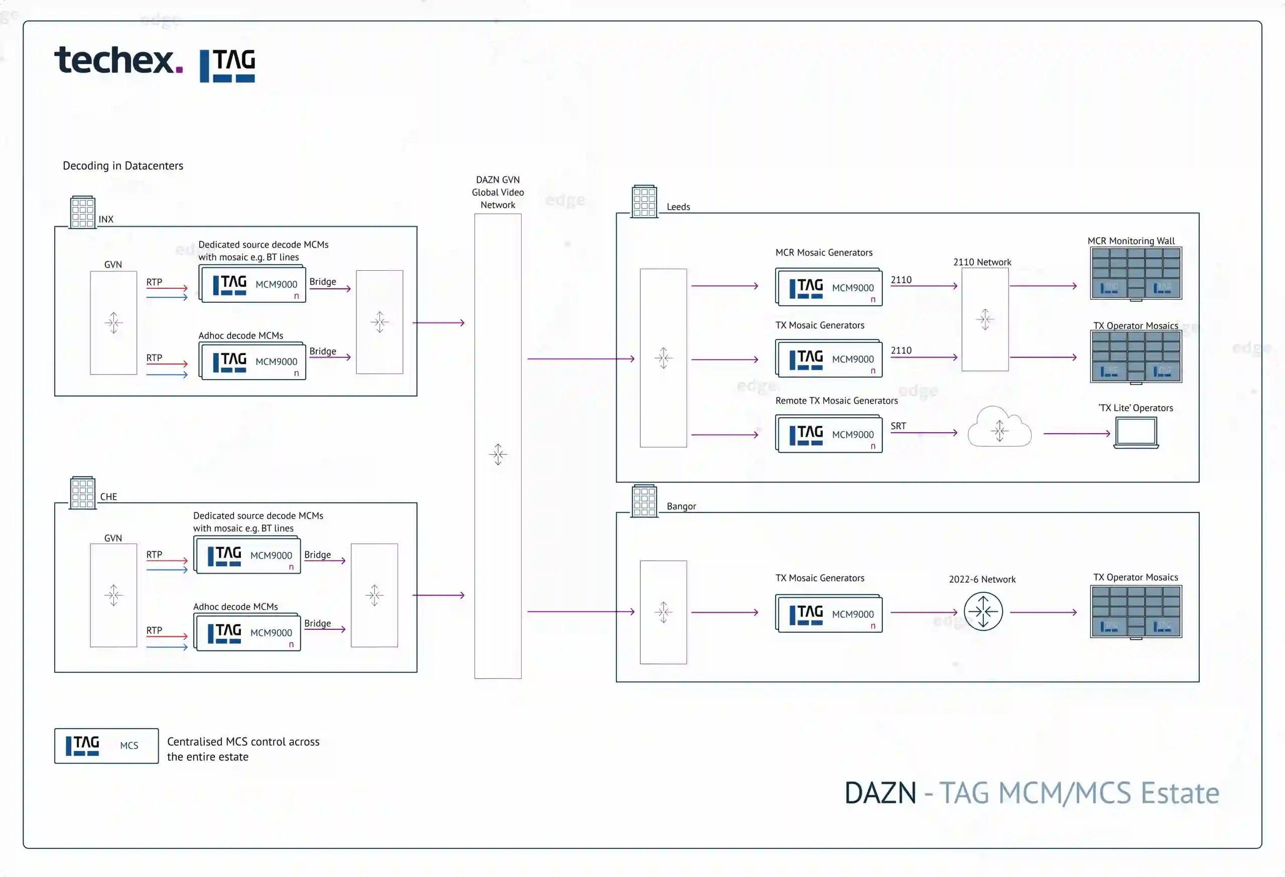 The system provides centralised control over more than 5,000 unique video sources and 300 mosaic layouts which, once at DAZN’s core data centres, are seamlessly routed to their operational hubs in Leeds, Northern Ireland and Hyderabad, powered by TAG’s Media Control System (MCS) and managed through a redundant central interface – reducing bandwidth usage, eliminating infrastructure duplication, and enabling any source to be routed to any operator or screen without reconfiguration.