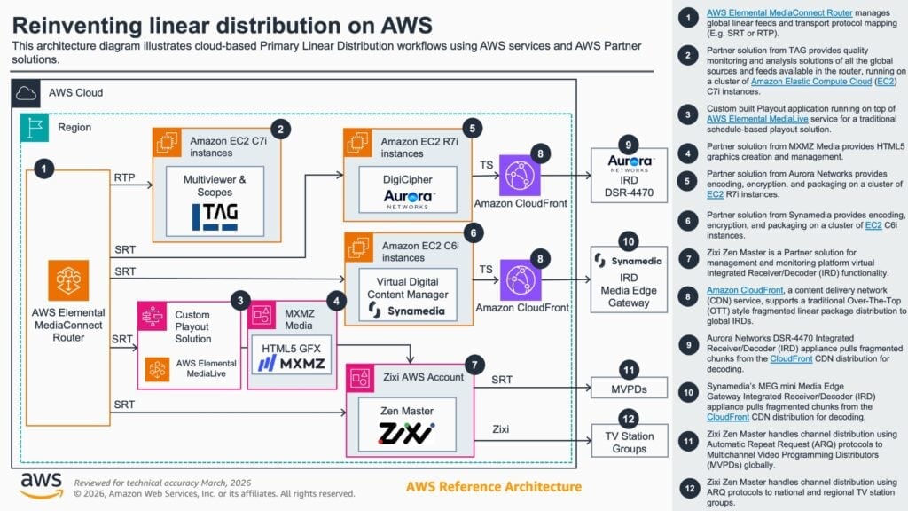 AWS Elemental MediaConnect Router, which reached general availability in November 2025, lets broadcasters dynamically route live video between sources and destinations within the AWS network: switching between primary and backup feeds, routing regional variants, and managing multiple feeds simultaneously, without reconfiguring infrastructure each time routing needs change.